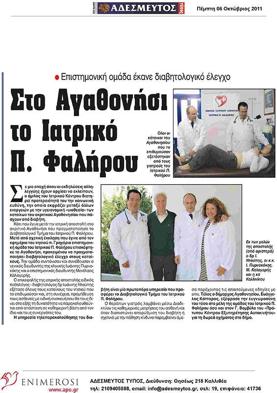 06 Οκτ 2011 Επιστημονική ομάδα έκανε διαβητολογικό έλεγχο στο Αγαθονήσι By admin Στο Αγαθονήσι το Ιατρικό Π.Φαλήρου Άρθρα Σχολιάστε